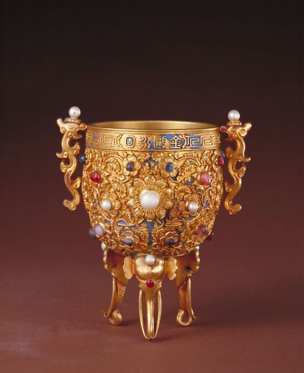 杯金质,鼎式,圆形,直口。口沿錾回纹一周,一面中部錾篆书“金瓯永固”,一面錾“乾隆年制”四字款。外壁满錾宝相花,花蕊以珍珠及红、蓝宝石为主。两侧各有一变形龙耳,龙头上有珠。三足皆为象首式,象耳略小,长牙卷鼻,额顶及双目间亦嵌珠宝。