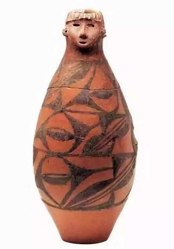 仰韶文化庙底沟类型彩陶。1973年出土于甘肃秦安邵店大地湾。细泥红陶。高31.8厘米,口径4.5厘米,底径6.8厘米。器形为两头尖的长圆柱体,下部略内收,腹双耳已残。口做圆雕人头像,披发,前额短,发整齐下垂。鼻呈蒜头形。鼻、眼均雕成空洞,口微张。两耳各有一小穿孔,头顶圆孔做器口,腹以上施浅淡红色陶衣。黑彩画弧线三角纹和斜线组成的二方连续图案三组。造型以抽象的线条与人头像相结合,颇具特色。装饰以雕塑与彩饰构成一体,极其自然。是一件既具实用性又具有艺术性的古代艺术品。