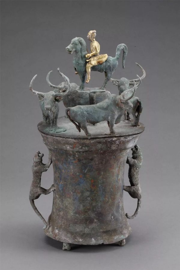 晋宁石寨山10号墓出土,该器为典型的束腰圆筒形的贮贝器,器腰两侧各装饰一个虎形耳,虎作向上攀爬状,无论是虎的总体外形,还是细节刻画都极其逼真,宛如两只真老虎附着在器身两侧。器物盖上有四只体格健硕的牛逆时针围绕中心作奔跑状,而中心有一个圆柱柄托盘,托盘上有一个骑着高头大马的骑士人物形象。战马昂首挺立,马尾挥洒上扬,口微张,目光锐利且炯视前方,而马背上的骑士为通体鎏金,威武的骑士腰部还有一柄佩剑,身着华丽服饰显得格外光彩夺目。华丽的服饰和佩剑,表示墓主人手握非常大的权利,而象征财富的牛体格健硕且围绕一个地位显赫的人,说明墓主人生前地位非一般人所能相比的,很有可能是一位古滇国皇族成员。