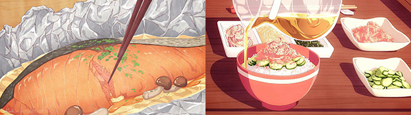 由于选择做成每月更新一集的播出模式,动画片单集内容选择除了注重“易得性”外,也迎合日本文化重视季节性的特点,每集不是呼应当月节日,就是使用应季食材。今年年初开播时恰逢“大晦日”(除夕),首集内容使用了漫画第二十回出现的荞麦面作为内容。荞麦面因其柔软易断而被日本人视为斩断厄运、驱邪迎福的吉利食品。第三集临近三月三日“女儿节”,于是做了女儿节造型的寿司饭,盛夏七月做的是冷茶渍饭,进入秋冬季后食物热量逐渐增高,十月做炸鸡,十一月做超软蛋包饭。