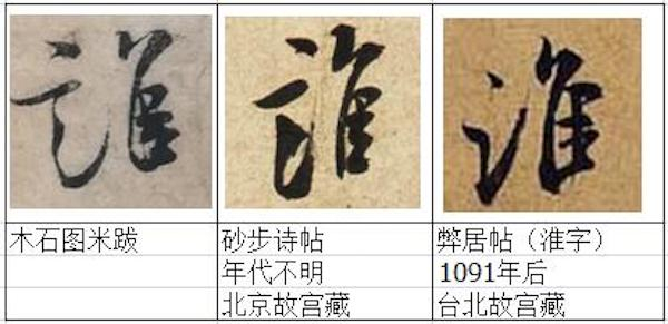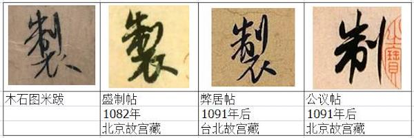其一:第一笔“撇”,和右边2字相比,起笔偏于中间,导致和捺笔的起笔相连,一连上这字就没有美感了,和右边两名帖相比,有异于米芾的书写习惯。