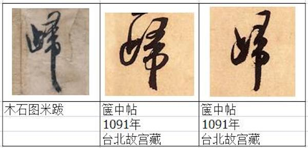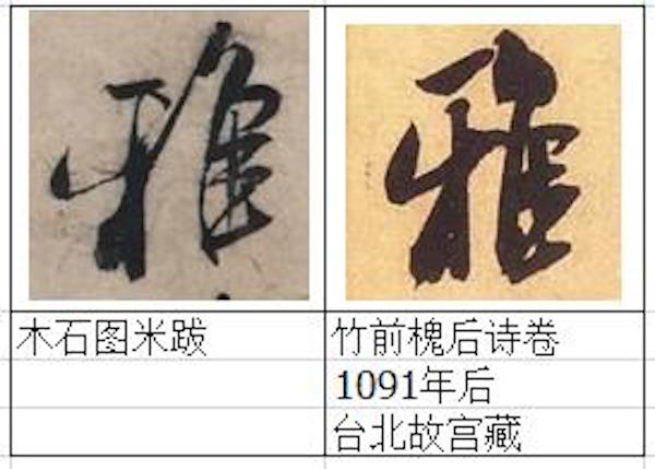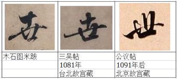 关于这幅图卷的米芾诗题后跋,其真伪问题此前“澎湃新闻”所刊文章曾从书风、存世米字样本对比、印鉴、文献等方面提出质疑。本文作者通过进一步详细对照北京故宫和台北故宫馆藏存世米芾墨迹真迹做标本,用笔迹鉴定学中的比较研究法来对其用笔、结字的细节进行解剖,认为《木石图》米芾后跋是伪作且集字的可能极大。