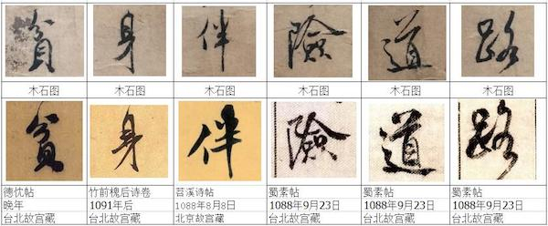 我们看米跋第二句:“贫知世路险,老觉道心微”,再看《苕溪诗帖》中的一句:“贫非理生拙,病觉养心功”,是不是很相像。我们把这二句都调出来放一起做对比,无需多言,高下立判。苕溪诗帖是米芾38岁时所作,而米跋是改款后41岁后作,这3年功力的精进对米芾是非常重要的,可我们看到的却完全相反,线条薄弱,行笔生涩,徒有外形,毫无筋肉,和米芾“风樯阵马、沉着痛快”之风毫不相干。米跋很多字都有来自这两帖的影子,有的完全是照葫芦画瓢的生硬摹仿。而这两帖又是米芾最为知名的,在1920年代初期,从事拍摄和影印清宫内府藏本的延光室曾发行过影印本,临习者众多。所以,我有个大胆的推测,米跋很有可能是根据《苕溪诗帖》、《蜀素帖》两帖为主要参照物的集字成诗的摹仿之作。如果集字成诗这一推测成立,就容易理解为什么米跋的内容和《木石图》完全无关。