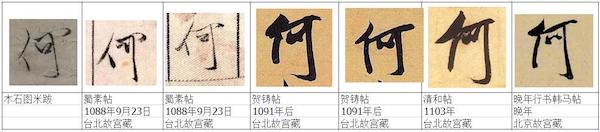 其三:左一“口”字和竖钩相连,蜀素帖中的口字离竖钩是有一定距离的。不要小看这点距离,这是前面“口”字写法不同而连带造成。而且通过对比我们可以发现,《蜀素帖》写于38岁,后面4个“何”字书写的年代更晚,长横的起笔处位于单人旁的交叉点,而且与之相连,从结构美学上看,后来的何字结字明显更为紧凑稳健,也可以看出米芾通过常年习字不辍所取得的进步。