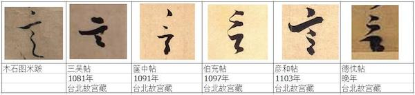 左一和米芾31岁时所书类似。但是这个字最后一笔的细节,也是令人尴尬的。左一最后这笔写成一个横“点”,而且中间形成一个小空心圆圈,不符合基本书写习惯,不合常理,也无美感。正常应该是竖笔撇下来之后,连笔做一个顿笔回转笔锋再右行的写法,右边两字正是如此。