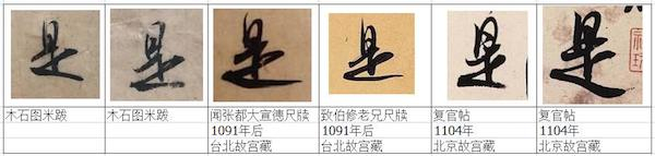 上图左边两个“是”字均来自米跋,前面的几笔都符合行书连笔快写的特征,可是最后三笔,正常也应该是快速连笔下去,可是我们看到最后三笔却是分成三次书写,完全停顿了,样子是行书,最后三笔却写成了楷书的速度,楷书的节奏,粗看是连笔,细看是三段断笔。而我们看右边的米芾标本,都是正常连笔,一气呵成。所以,这2字符合太多摹仿笔迹的特征,形快实慢、笔力平缓、运笔生涩、中途停顿。