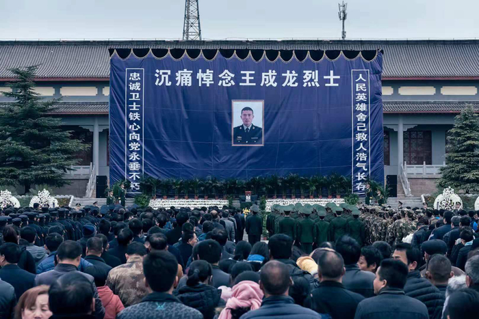 12月4日,王成龙的骨灰被武警官兵护送着离开济南莲花山殡仪馆,回到他的老家——山东省临沂市莒南县。次日,王成龙的葬礼在莒南县鲁东南烈士陵园举行。“忠诚卫士铁心向党永垂不朽”“人民英雄舍己救人浩气长存”——悬挂在王成龙遗像两侧的挽联概括了王成龙短暂光荣的一生。