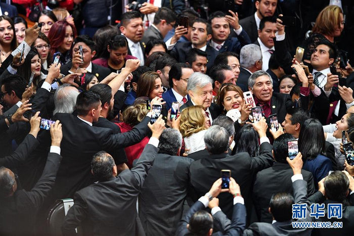 12月1日,在墨西哥首都墨西哥城,安德烈斯·曼努埃尔·洛佩斯·奥夫拉多尔发表总统就职演说。 当日,墨西哥当选总统安德烈斯·曼努埃尔·洛佩斯·奥夫拉多尔从恩里克·培尼亚·涅托手中接任总统一职,正式成为墨西哥总统。 新华社记者辛悦卫摄