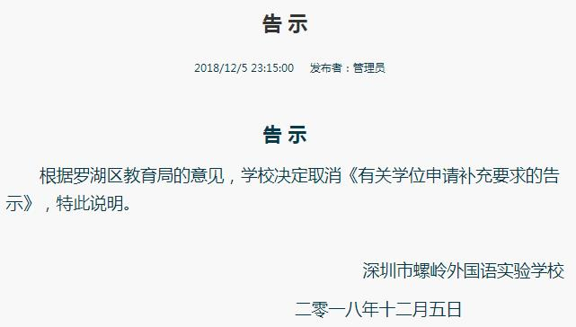 此事经媒体报道后,引起舆论热议。澎湃新闻(www.thepaper.cn)注意到,5日深夜11时15分,深圳市螺岭外国语实验学校在其官网上宣布,“根据罗湖区教育局的意见”,学校决定取消《告示》。当晚,上述在官网上挂了不到两天的《告示》已被该校撤下。