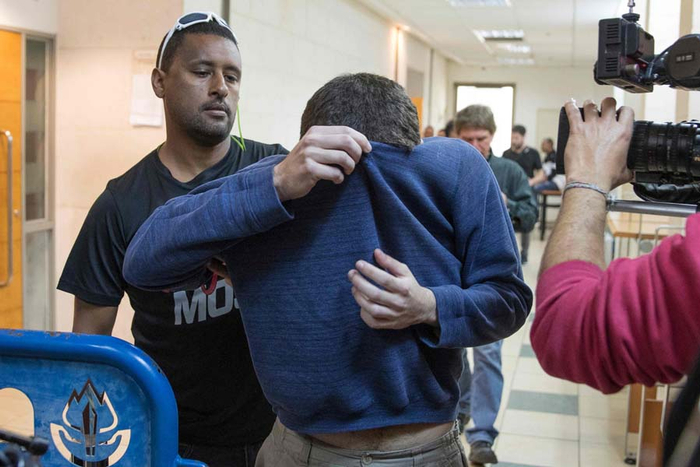这是2017年3月23日,在以色列里雄莱锡安的法庭拍摄的双重国籍男子迈克尔·卡达尔(中)。以色列一家法院11月22日判处有以色列和美国双重国籍的迈克尔·卡达尔10年监禁,缘由是他2016年和2017年间谎报炸弹威胁大约2000次。新华社/法新