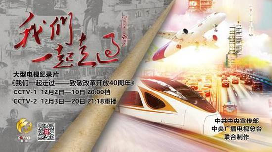 由中共中央宣传部、中央广播电视总台联合制作的《我们一起走过——致敬改革开放40周年》十八集大型电视纪录片12月2日起在央视综合频道20:00档播出,每天播出两集,次日晚间21:18央视财经频道重播一集。
