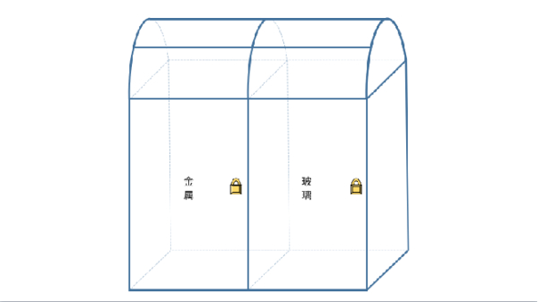 第二种垃圾桶可以收集金属和玻璃。分为左右侧。两边收集口开放式倾斜,便于居民投放垃圾。