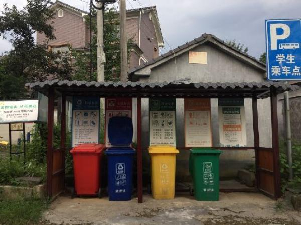 村中垃圾分类宣传点以及“四分类”垃圾桶:蓝色可回收、绿色厨余、红色有害垃圾、黄色其他垃圾