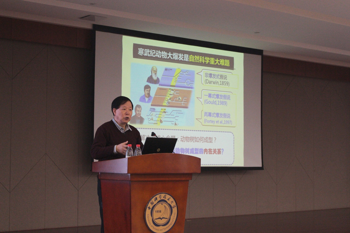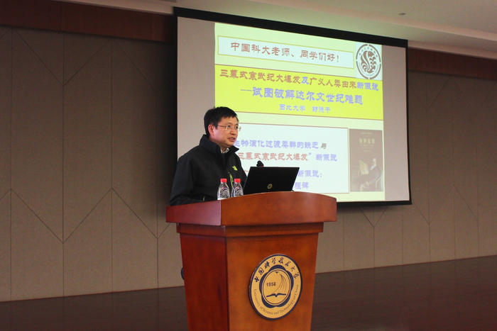 11月30日,应地球和空间科学学院邀请,西北大学早期生命研究所所长、中国科学院院士舒德干教授做客中国科大“赵九章•侯德封大师讲堂”,在东区活动中心五楼报告厅作了题为《三幕式寒武纪大爆发及广义人类由来新假说——试图破解达尔文世纪难题》精彩学术报告。