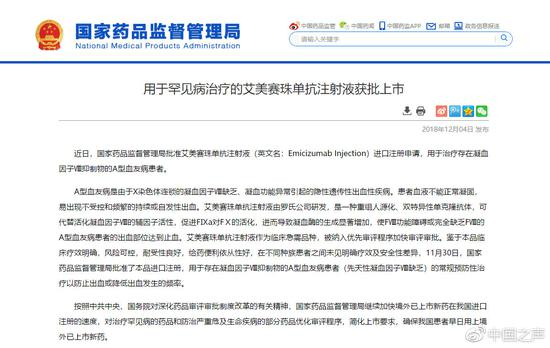 2017年11月,艾美赛珠单抗率先在美国获批注册上市,随后被中国药监部门纳入优先审评审批目录,即进入“绿色通道”。罗氏制药相关工作人员向媒体透露,这款药物正式上市时间或许要等到2019年第一季度。