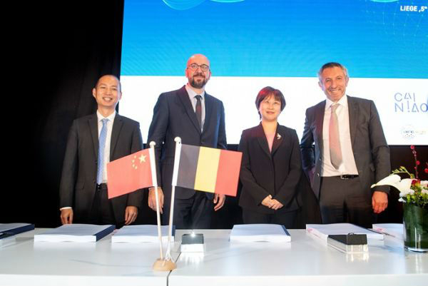 比利时副首相克里斯·佩特斯(Kris Peeters)和阿里巴巴集团资深总监宋君涛签署了《eWTP谅解备忘录》。比利时首相米歇尔(Charles Michel)和阿里巴巴集团全球化事业部总裁、阿里巴巴集团资深副总裁赵颖见证了这一时刻。(阿里供图)