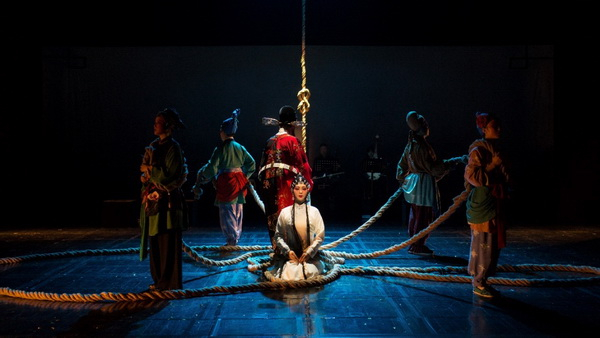 导演江瑶在剧中更是用了很多当代剧场的手法。两根麻绳、一桌六椅,是全部布景道具,全剧仅有的六个人物,在100多分钟的演出时段里始终不下场,人物跳进跳出同时,又给戏曲的表演留足了空间。整部剧十分诙谐有趣,有不少地方,透着一种漫画式的荒诞感。