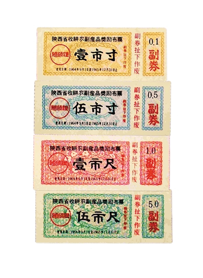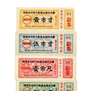 七、尺寸合一布票。凡是面额量词中有尺、寸、分的布票,人们就称其为“尺寸合一”布票,例如,7尺5寸、2尺8寸半。新疆布票用的是米制单位,所以有些品种面额中含米和厘米等量词,如4米83厘米。有人选择尺寸合一布票进行专题集藏,难度较大。