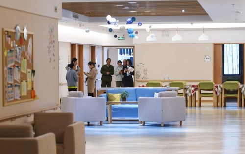 主要为两层分布。一楼主要是生活与护理单元、商业休闲娱乐区与公共活动空间。我们设置了咖啡茶吧、书吧、阳光露台等供长者日常休憩,还有康复理疗区、棋牌室、家庭厨房、儿童乐园等休闲场所。