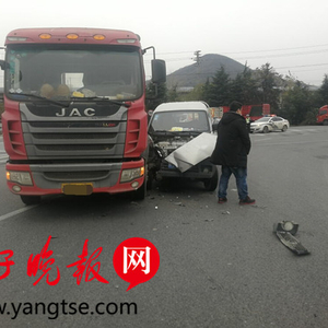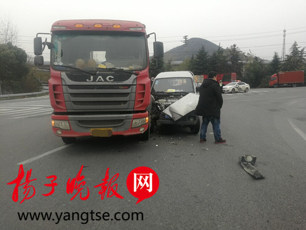 警方介绍,7日12时50分许,镇江丹徒区戴家门转盘发生一起两车相撞的交通事故。一辆大货车撞上一辆小货车的右前侧,造成小货车引擎盖脱落,车头变形,所幸未有人员受伤。
