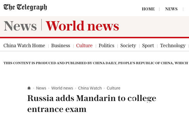 不只在荷兰,俄罗斯人也展现出对汉语的极大热情。由于俄罗斯学习汉语的人数大涨,俄罗斯教育部干脆直接将汉语加入进俄罗斯的高考科目中。据英国《每日电讯报》网站报道,汉语已经成为继英语、德语等第五个入选俄罗斯高考的语言科目。