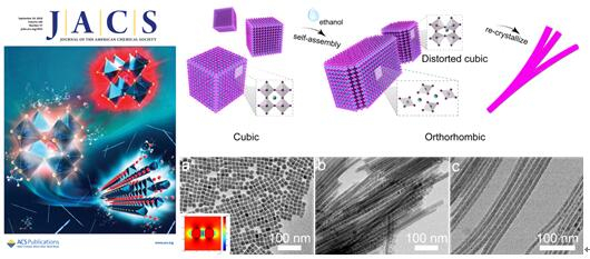 钙钛矿电池的稳定性是其应用的瓶颈和关键。研究人员在钙钛矿层与HTL间引入高迁移率疏水共轭高分子界面层,一方面改善空穴的提取效率,另一方面可以有效阻隔湿气与传输层中添加剂对钙钛矿层的侵蚀,从而显著提高了钙钛矿太阳能电池的空气稳定性和光电转换效率(Solar RRL, DOI: 10.1002/solr.201800232,inside cover;Nano Res., 2018, 11,185-194)。相比于有机无机复合钙钛矿材料,纯无机钙钛矿材料表现出更优异的热稳定性。其中,立方相CsPbI3具有合适的带隙而备受关注,但其立方相室温下是热力学不稳定相,因此理解立方相CsPbI3在合成与器件制备过程中的相不稳定性机制,进而制备室温下相稳定的光伏相CsPbI3,对于其在光伏和光电领域中的应用具有重要的意义。研究人员近期首次从原子尺度上观测到了极性溶剂会诱导立方相CsPbI3纳米晶晶格发生畸变,进而相变失稳,从实验和原理上解释了极性溶剂对立方相CsPbI3纳米晶稳定性的影响,揭示了极性溶剂诱导立方相CsPbI3纳米立方体相变的机制及其多级次自组装成单晶纳米线和微米线的机制(图3)。这一研究结果对理解立方相CsPbI3相不稳定机制提供了新的认识,并为立方相CsPbI3的制备及保存使用过程中的溶剂选择提供了指导,推动了其在光电及光伏领域的应用。相关工作发表在J. Am. Chem. Soc., 2018, 140, 11705–11715上,并入选当期封面。