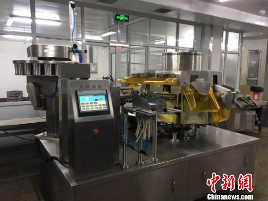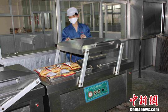 流水线上的工人操作机器进行包装。 邹方明 摄