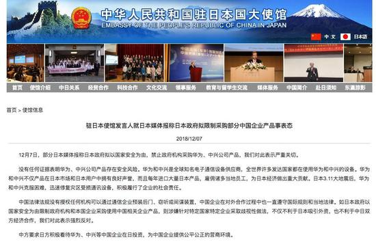 此前中国驻日大使馆也在官网发表声明,对日本禁止政府机构采购华为、中兴产品表示严重关切。