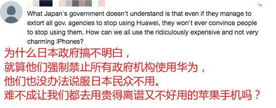 还有人吐槽道:“为什么日本政府搞不明白,就算他们强制禁止所有政府机构使用华为,他们也没办法说服日本民众不用。难不成让我们都去用贵得离谱又不好用的苹果手机吗?”