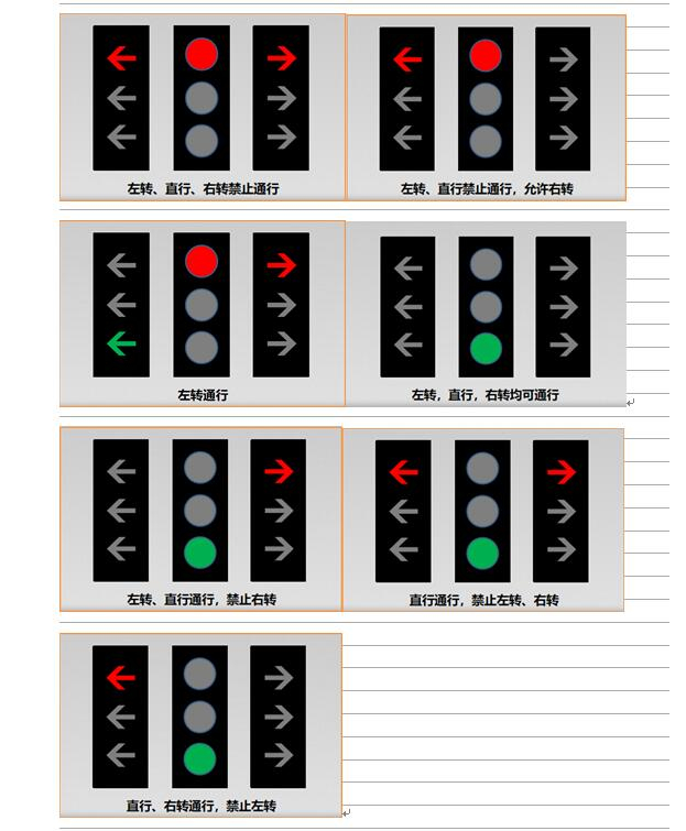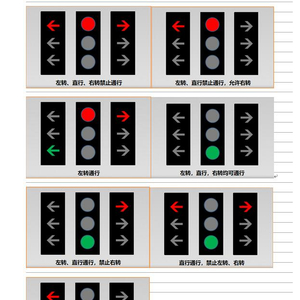 打个比方,如果圆盘灯是绿灯时,而左右两边转向灯都不亮的情况下,这就意味着此时路口直行、左转弯、右转弯三个方向可以同时通行。当圆盘灯是红灯,左右两边转向灯都不亮的情况下,左转弯是禁止通行的,而右转弯是可以通行的。此时,如果右转向灯出现箭头红灯,这就意味着三个方向全部禁止通行。