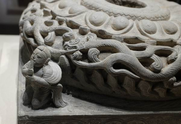 石雕柱座,呈覆盆状带方形底座,材质为细砂岩,中央有柱孔,以柱孔为中心,内周依次浅浮雕綯纹、联珠纹、双莲瓣纹;外围雕重层双莲瓣纹,鼓腹部高浮雕四条蟠龙首尾相逐于山峦之上;方形底座四面浅浮雕环状缠枝忍冬纹和波状忍冬纹,环内或波带上下雕伎乐童子,方形底座四角各圆雕一伎乐童子。或为漆屏风的柱座。此前“澎湃新闻”记者在大同是博物馆和山西博物院各见过一尊石雕柱座,其上伎乐童子雕工精美,形象生动。