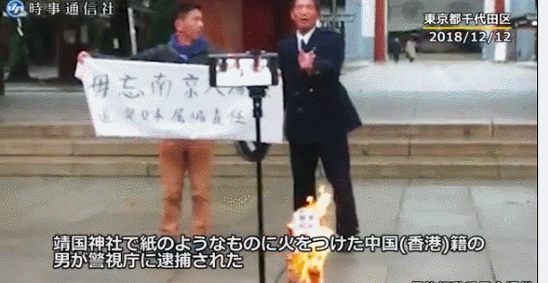 当地时间12日早晨7点左右,靖国神社神门前,一名男子手持“勿忘南京大屠杀”字样的旗帜,口中连续喊着“打倒军国主义”、“日本道歉”等,并点火燃纸。之后,被发现火情的靖国神社工作人员控制住。据东京消防厅消息,火很快熄灭,建筑物未受损。