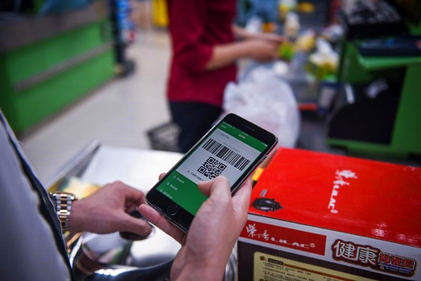 图说:很多人习惯用微信钱包在超市结账。新华社