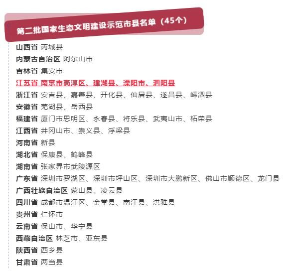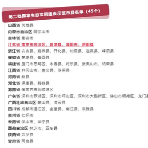 交汇点讯 2018年12月13日,生态环境部办公厅印发《关于命名第二批国家生态文明建设示范市县的公告》,江苏省南京市高淳区、建湖县、溧阳市、泗阳县等四地榜上有名!