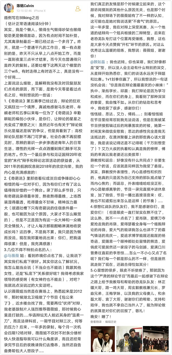 唯一被反复提及的,是其他辩手们用“在世界中心呼唤爱”在调侃他——不管什么样的辩题,怎样的持方,到了陈铭,他总是彬彬有礼站起来,先是逻辑严密地反驳性扫射,然后是情感充沛地举例,正能量饱满地呼吁,最后无论票数输赢,他都鞠躬结束。这一整个过程至今都没有变化,甚至连状态高低的起伏都很少见。