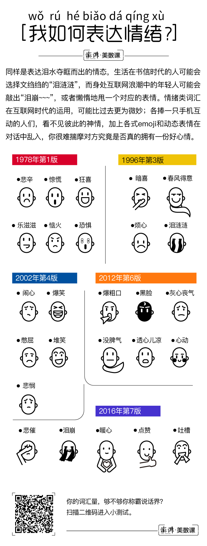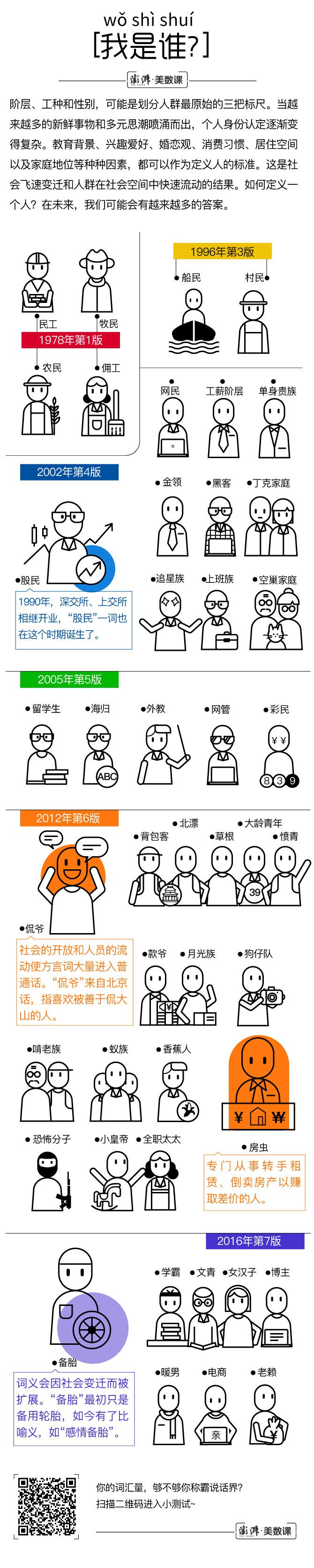 从这个层面看,《现代汉语词典》也是中国人生活的记录者。我们在下文的长图中列出了你可能关心的七个问题,有关身份认定、住房问题、饮食、穿着、消磨时光的方式、与人沟通的途径以及个人的情绪表达,去看看你的生活究竟发生了什么变化吧!