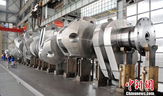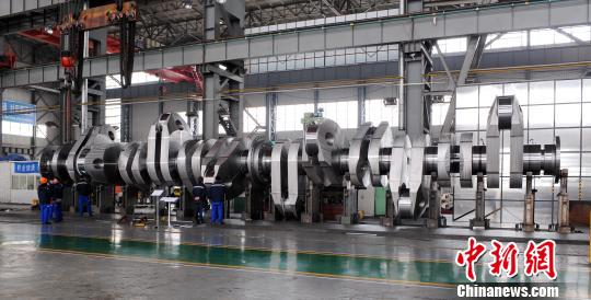 中国造世界最大集装箱船用曲轴在辽宁大连下线