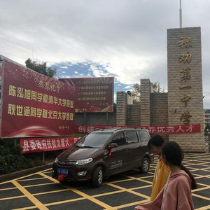 禄劝县第一中学门口,竖立的牌子上是被清华、北大录取的两名同学的名字