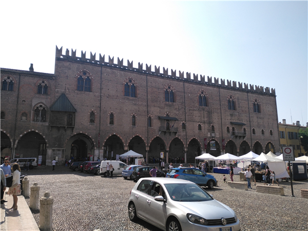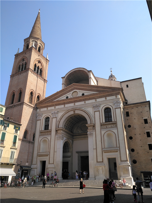 2018年,当我来到这座荣获世界文化遗产称号的小城,站在视域开阔的广场上时,主要被两个看点吸引着。一个是建筑师阿尔伯蒂设计的教堂,一个是画家曼特涅绘制的壁画。由于门票的误会,没能进入曼特涅壁画所在的古旧城堡中,却参观了路德维科为教皇等宾客建造的宽敞的房间和壮观的新堡。在新堡对面,就是阿尔伯蒂设计的圣安德里亚教堂。