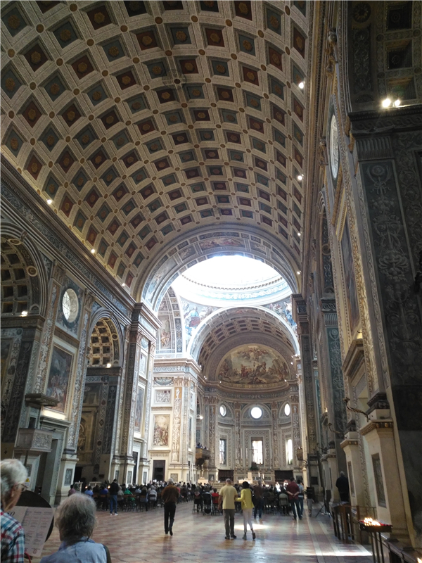 为了寻找这座“毛坯”教堂,我顶着烈日从贡扎加家族宫殿向南行走了很远,笔直的道路使行人无法躲避直射的阳光。只有在这时候,才能意识到中世纪和文艺复兴时代的差异,中世纪曲折蜿蜒的道路,有可能也是当时人们的智慧结晶,至少可以躲避南欧的强烈阳光和雨水,而文艺复兴时期,为了凸显君主王侯的权力,在空间上进行了革命,道路被拉直,建筑被封闭,一切都体现了理性、秩序和辉煌,再也难以体会到人性的细腻,建筑为权力的讴歌,大致就是从中世纪的消退开始的。