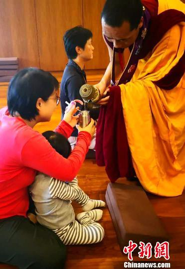 应台湾中华汉藏佛教文化融合促进会邀请,中国藏语系高级佛学院交流团一行12月13日抵台,开展为期一周的佛教文化交流。图为16日汉藏祈福法会在高雄古岩寺举行,信众接受祈福法会净水。中国藏语系高级佛学院提供