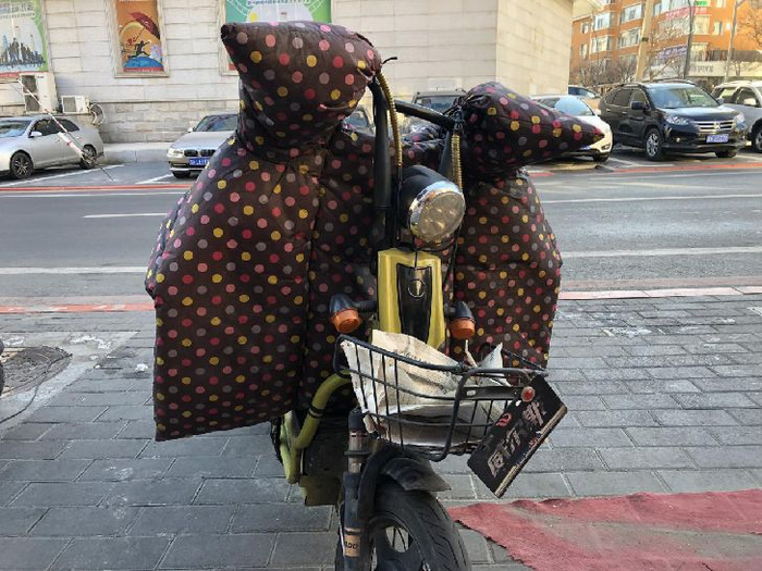 于是,东北骑手们纷纷给爱车披上挡风被,保护自己的安全和健康。