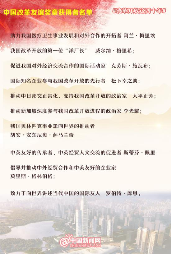 在国内的100人之外,为感谢国际社会对中国改革开放事业的支持和帮助,党中央、国务院还决定,向阿兰·梅里埃等10名国际友人颁授中国改革友谊奖章。