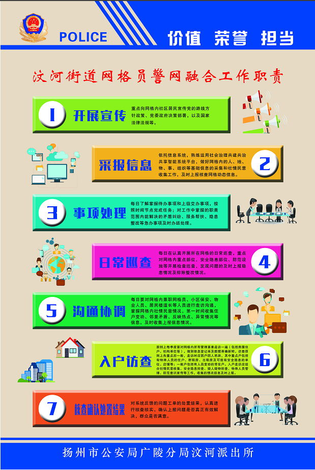 近年来,广陵公安人主动将社区警务工作融入党委政府网格化建设,探索创新推出“警网一体化”网格化管理模式,牵头制定下发了《广陵区“警网一体化”实施意见》及考核奖惩办法,明确社区警务工作要主动牵引网格工作开展,努力实现警网融合、警网一体化运作。