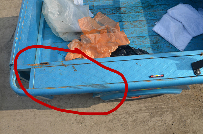然而,办案民警却没有放弃,为排除非单方事故的可能,办案民警立即与刑警大队联系,前往停车场对涉案电动三轮车进一步勘验,结果发现该车除右侧多处倒地刮擦痕外,其右后部车厢内侧有疑似受外力(尖锐物体)碰撞形成的痕迹及轮胎擦痕。得到该线索后,办案民警又立即驱车重新勘验现场,但在现场未能找到能导致该痕迹形成的物体,既然现场无尖锐物体,那车上的痕迹从何而来?只有一种可能性,就是该电动三轮车案发时曾与其他车辆发生接触。