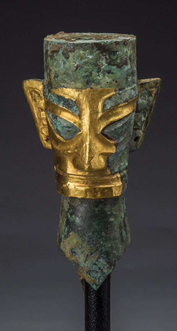 此件戴金面罩青铜人头像出土于三星堆遗址二号祭祀坑,由铜头像和金面罩(残)两部分组成。三星堆出土了相当数量的青铜人头像,戴金面罩的仅四件。铜头像面容消瘦,粗眉,立眼,直鼻,阔口,戴金面罩上沿至眉梢。和一号坑出土的青铜面具风格一致,青铜人像重点强化眼、嘴、鼻、耳的五官特征,整体造型较夸张,神情威严凝重,体现出神秘而庄严的美学风格。三星堆出土的青铜人像、面具、头像,有的学者认为人头像应是祖先神像,跪坐人像是主持祭祀活动的巫师,人、兽面具是巫师做法的巫术法器,是沟通人神的工具,这些体现了古蜀人民祖先崇拜的宗教意识。