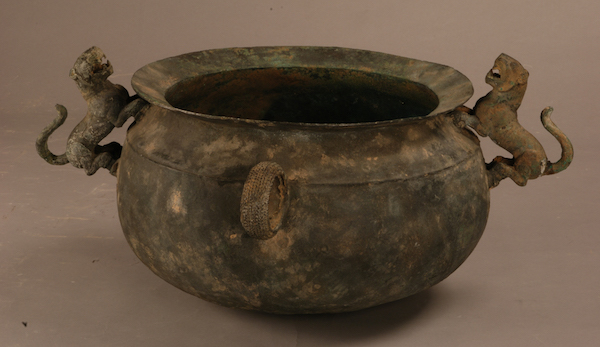 铜釜是流行于战国秦汉时期的炊器和容器,讲述项羽背水一战破秦国大军的成语“破釜沉舟”,其中的“釜”就是这种器物。此件饰虎铜釜出土于赫章可乐,个头较大,出土时侧立套于死者头部。器型与巴蜀地区铜釜器型接近。敛口折沿,鼓腹、圜底。肩腹部对称饰一对圆雕立虎,虎头高昂,虎口张开,龇牙长啸,颈部饰一条项圈,项圈上饰贝纹,尾巴上扬卷曲,身体消瘦矫健。虎的造型和巴蜀地区所出虎钮錞于上虎造型风格相似,透露出威严的气度和矫健的力量之美。虎作为一种威武勇猛的动物,在古代常将其视为兽王,“虎符”、“虎将”、“虎帐”、“虎贲”可见其武勇。此铜釜上的饰虎却颈部饰项圈,似透露出虎对墓主人的臣服,更体现墓主人身份高贵,能力超强。铜釜器壁外布满烟痕,可见铜釜不仅作为赫章可乐乙类墓中套头、足的葬具在使用,在死者生前它也作为实用器——炊器在使用。