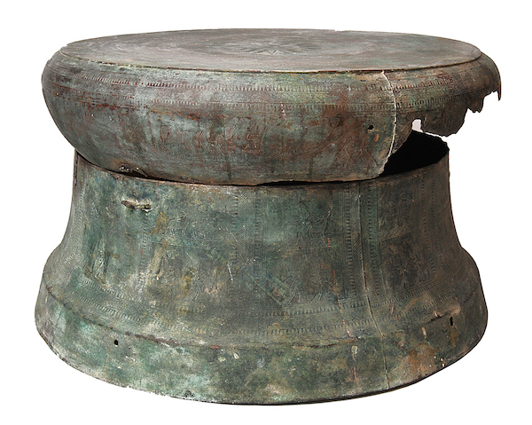 铜鼓是西南青铜文化中独具特色的器物,是我国西南和中南半岛最具代表性的铜乐器,常用于宴饮乐舞、集会祭祀等场合。铜鼓的类型多样,可分为万家坝型、石寨山型、冷水冲型、北流型、遵义型、灵山型、麻江型、西盟型八个类型。广西是铜鼓发现最丰富的地区之一。鼓面是铜鼓的重点装饰部分,常见的装饰纹饰有太阳纹、翔鹭纹、鹿纹、龙舟竞渡纹、羽人舞蹈纹、云雷纹、圆圈纹、钱纹等。