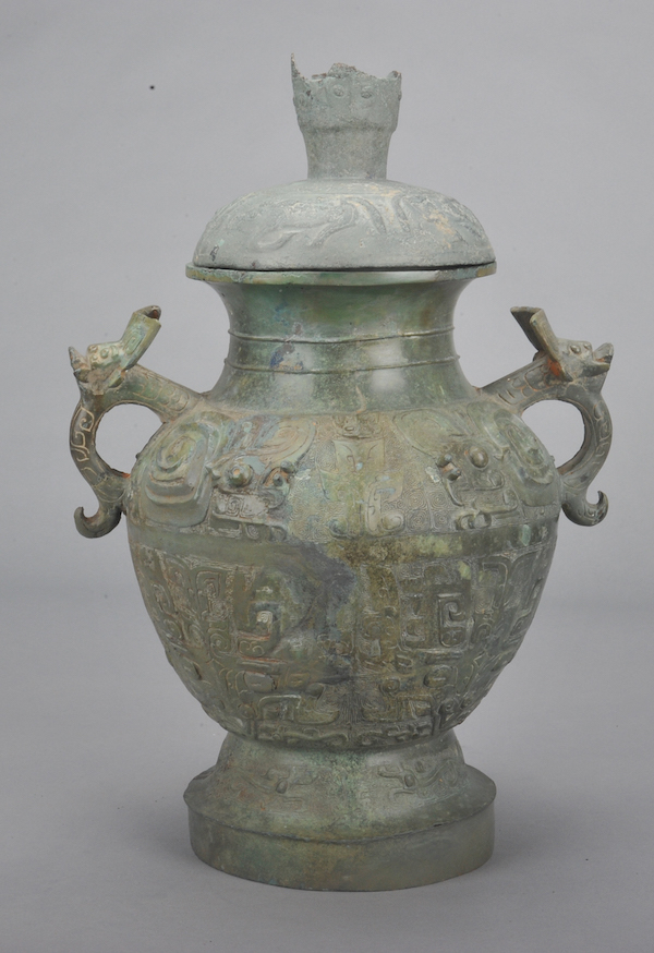 罍(léi)是战国时期流行于蜀地的青铜容器,罍不仅是酒器,也是“不得以与人”(即不能随便给人)的礼器。《诗经·周南·卷耳》“我姑酌彼金罍”、《史记·梁孝王世家》“善保罍樽,无得以与人”、典故“梁王争罍”中所说的“罍”就是这种器物。此件铜罍出土于彭州竹瓦街窖藏,盖顶残,侈口束颈,圆肩,圈足外撇。器耳作兽首状。盖面饰牛纹,牛前肢弯曲,似将卧状,眼、耳、口、鼻、足、尾等细节刻画逼真,体格健壮有力。肩、腹、圈足等部位均以云雷纹为底纹。肩部主纹是两两相对的团龙纹。腹部饰以兽面纹。兽面纹是青铜器上常见的装饰纹饰,此铜罍上兽面纹面部巨大夸张,装饰性极强。圈足为夔纹。此件铜罍造型庄重素雅,纹饰浮雕较低。巴蜀地区所出青铜礼器具有明显的楚式风格,此件铜罍却是典型的中原商周青铜器风格,与中原出土的同类器相似。体现了战国时期,中原与蜀地文化、物质方面的密切交流。