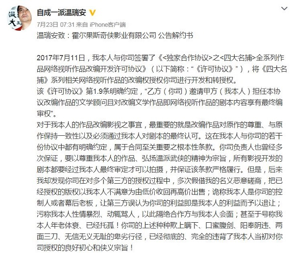 2018年7月23日,温瑞安在微博上发布了《致霍尔果斯奇侠影业有限公司公告解约书》,以《四大名捕》网络电影的剧本内容未经作者本人审阅的缘由,公告解除与霍尔果斯奇侠影业有限公司于2017年7月11日签订的《<独家合作协议>之<四大名捕>全系列作品网络视听作品改编开发许可协议》,并收回全部授权许可。